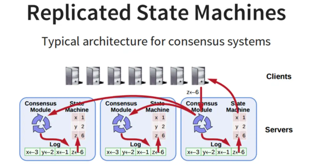 - leader收到请求,将信息复制到replicated state machine