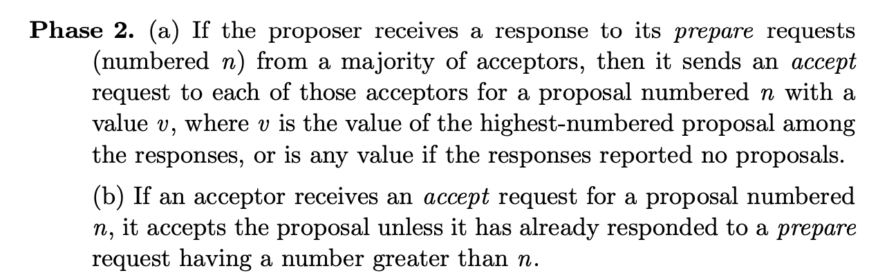 阶段a: 如果proposer从大多数acceptor中接收到对prepare请求的回复,它将向这些acceptors发送一个编号为n,value为v的accept请求,v是这些回复中最高编号的提案,或者响应报告中没有提案,v是任意值。