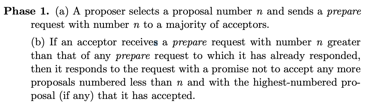 阶段b: 如果一个acceptor收到了编号为n的acceptor请求,它会接受该提案。除非已经回复过编号大于n的prepare请求。