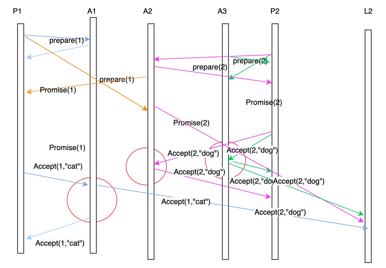 P2分别向A2 A3发送序号为2的prepare请求,A2 A3之前没有接受过序号更大的prepare消息,因此会向P2返回一个序号为2的promise请求。